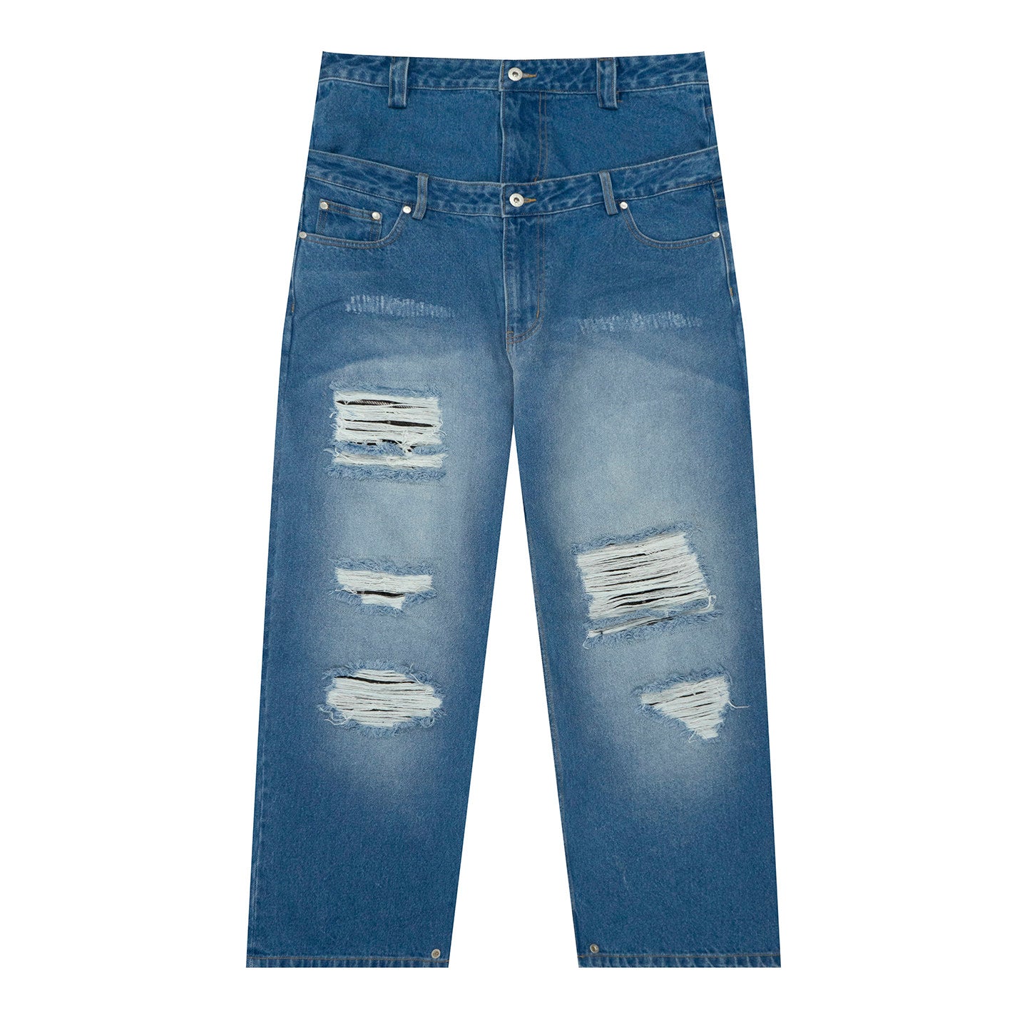 GRAF&WU Streetwear Double Waist Jeans Distressed Ripped Baggy Pants - Viral Y2K Denim